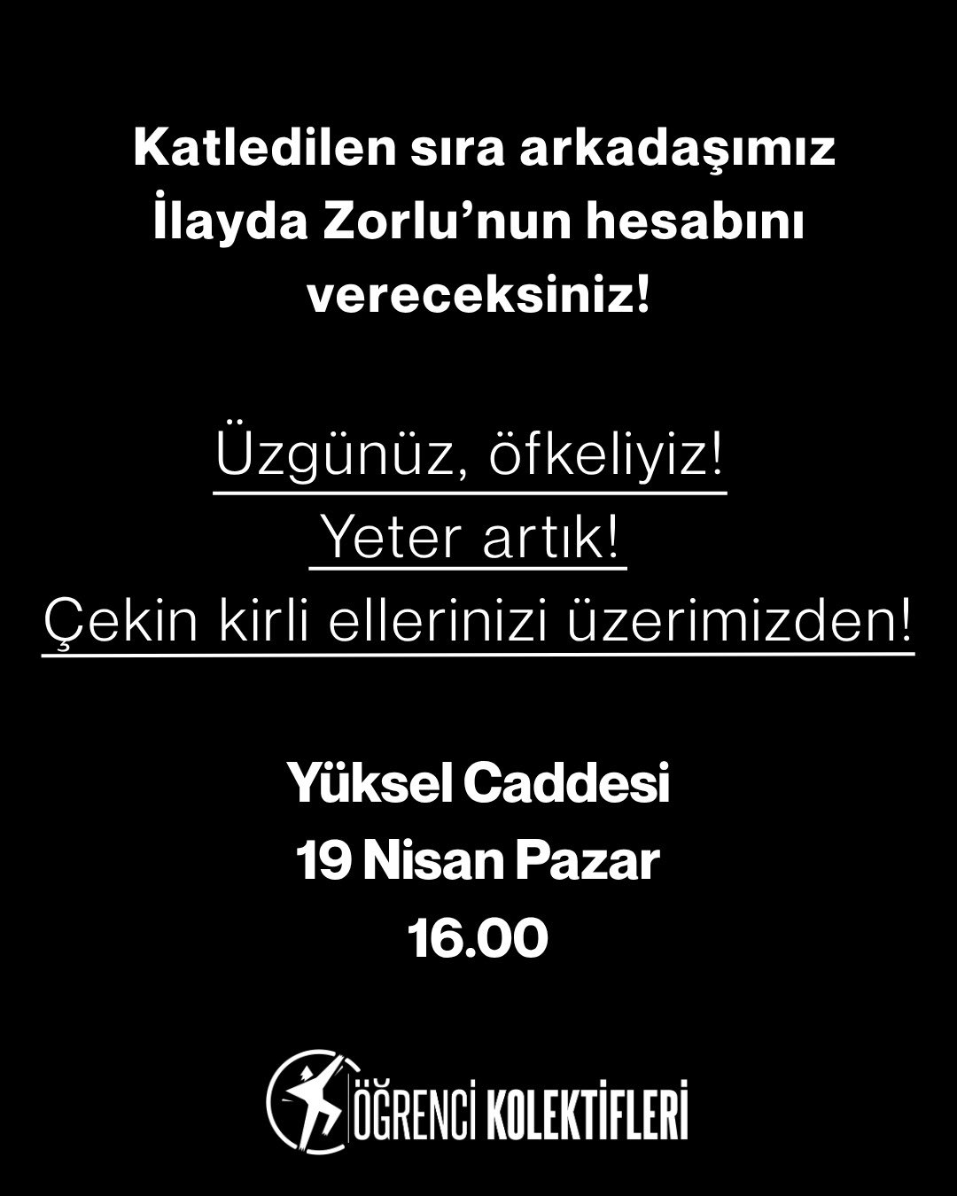 “Suçlular ortaya çıkana kadar bu işin peşini bırakmayacağız” diyerek kararlılıklarını vurgulayan Öğrenci Kolektifleri, İlayda Zorlu’nun ölümüne karşı sessiz kalmıyor. Arkadaşlarının yaşamdan koparılmasının hesabını sormak isteyen üniversiteliler, 19 Nisan Pazar günü, saat 16.00’da Ankara’da eylemde olacaklarını duyurdu.